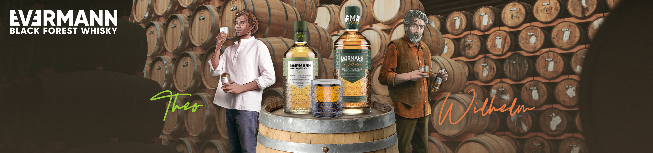 Zweifach destillierter Whisky aus dem Schwarzwald – zwei starke Charaktere, die sich in Geschmack und Vermählung zwar unterscheiden, im Kern jedoch die gleiche Seele besitzen: die EVERMANN BLACK FOREST Whiskys. Theo steht für den modernen Whiskygenuss, amerikanisch inspiriert, ein echter Abenteurer. Wilhelm ist ein echter Schwarzwälder, mild, fruchtig und im Abgang kraftvoll aromatisch.